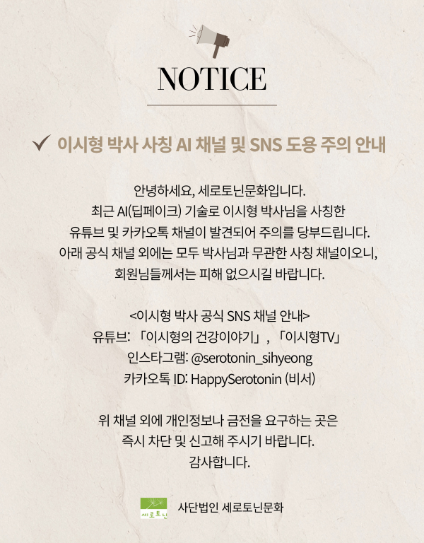 사단법인 세로토닌문화 | 사업자등록번호 214-82-12789 | 대표자 이희수 (06708) 서울특별시 서초구 명달로8길 21, 202호